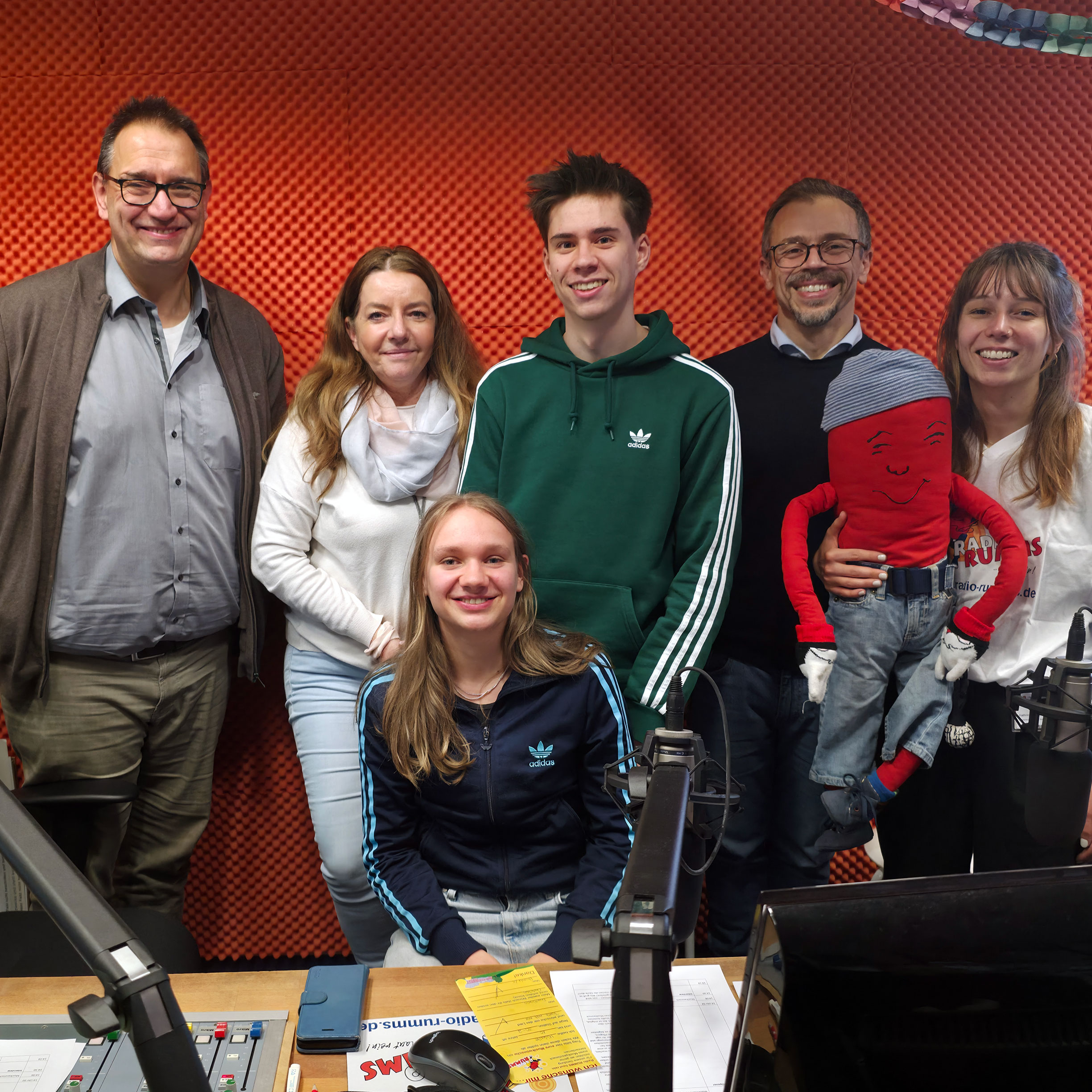 Schülerinnen und Schüler sowie eine Lehrkraft der ATA/OTA Schule (UMM Akademie) haben uns bei unserer Sendung am 19. Dezember 2024 im Studio besucht. Im Rahmen eines Waffelverkaufs in der UMM sammelten diese insgesamt 751,15€. Diese Summe wurde komplett an Radio RUMMS gespendet und bei der Sendung im Dezember offiziell übergeben. Oliver Roggisch, der bei dieser Sendung ebenfalls Studiogast war, hat die Spende prompt auf 1.000€ aufgerundet. Auf dem Foto zu sehen sind von oben links nach oben rechts: Frauke Hess (Redakteurin Radio RUMMS), Oliver Roggisch, Kathrin Burkhardt (Projektkoordinatorin Radio RUMMS), Lisa Stopfer und Abdullah Alahmad von der ATA/OTA Schule. Von unten links nach unten rechts: Marina Schmidl (ehrenamtliche Mitarbeiterin bei Radio RUMMS), Kari Fein und Lillian Plößer von der ATA/OTA Schule sowie ihre Lehrerin Lena Müller. Vielen Dank an alle für ihre Mühen und die tolle Unterstützung!